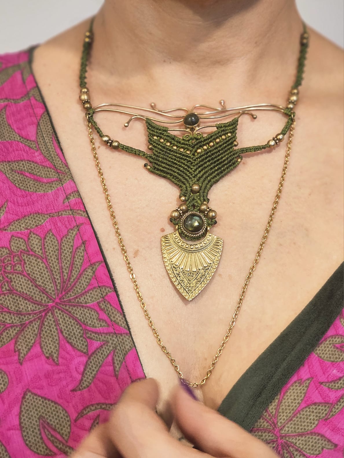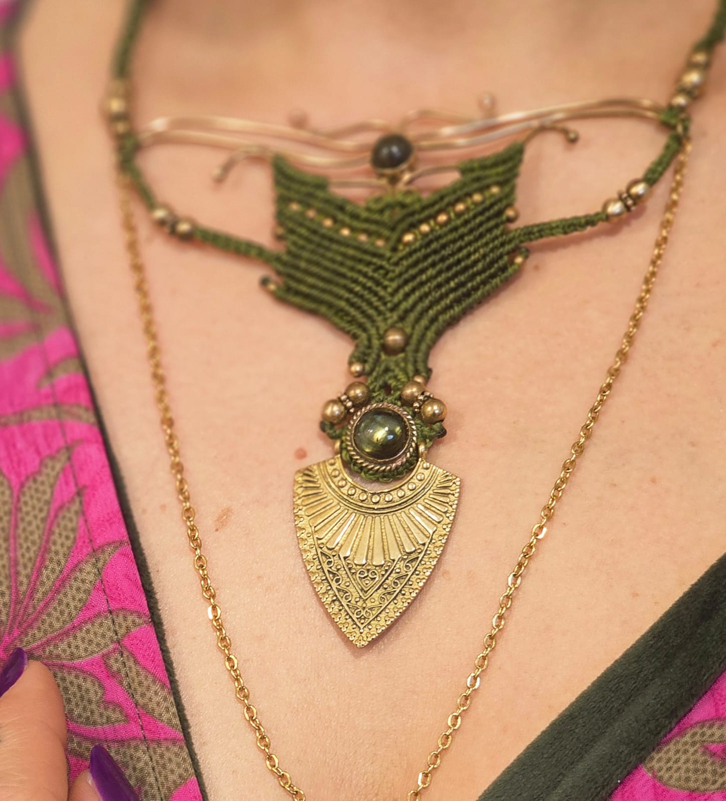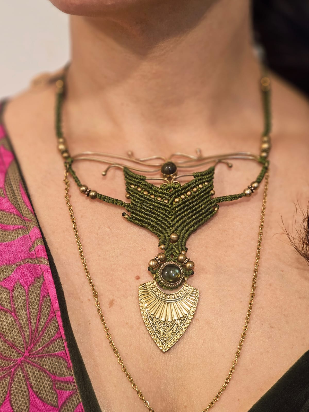 Tecida à mão em macramé, em tons verdes profundos, esta criação carrega a força da terra e o mistério do invisível. Os elementos em latão e aço desenham uma estrutura orgânica que se estende sobre o peito como uma proteção sutil.