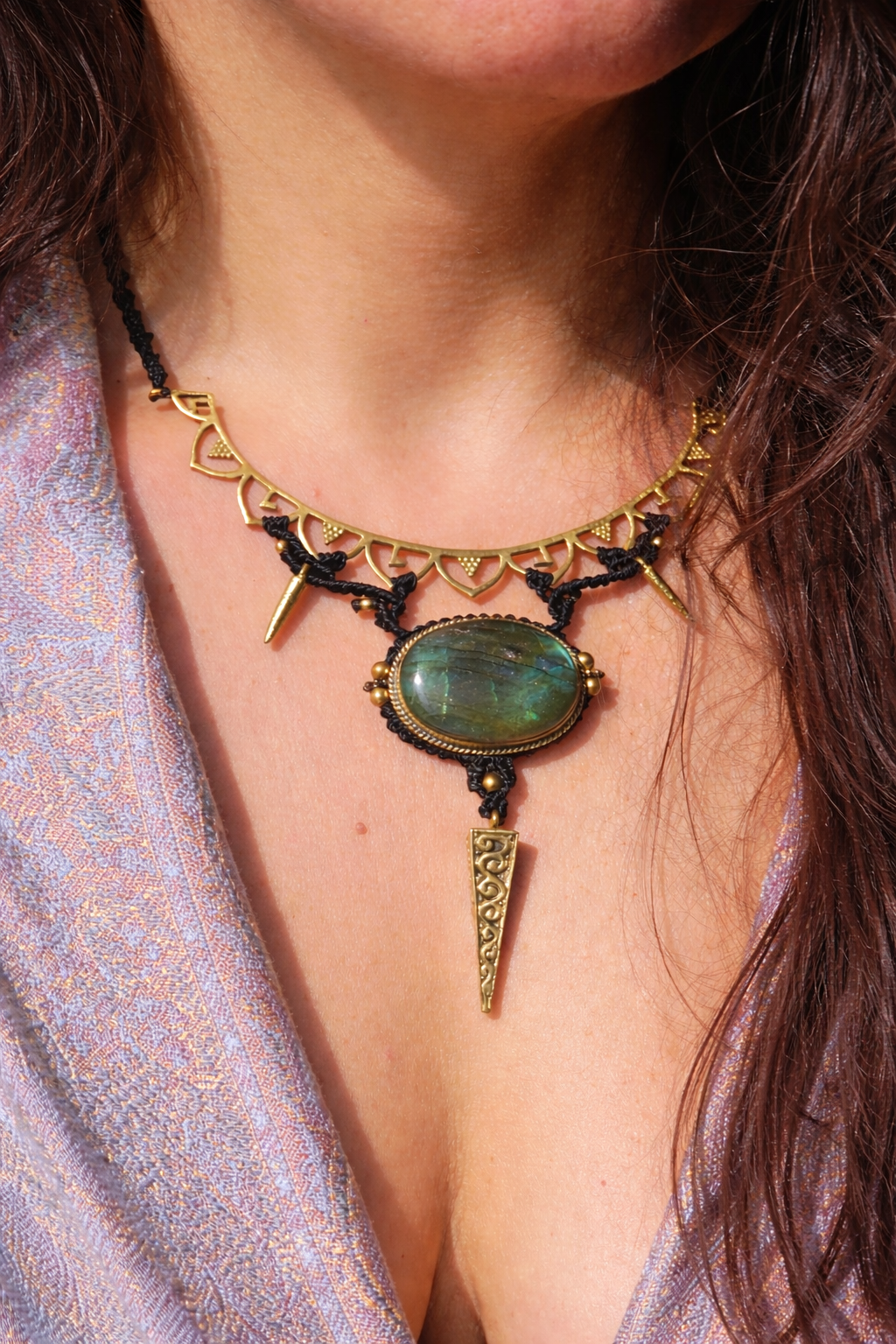 Colar artesanal com labradorite natural, combinando macramé feito à mão e elementos em latão.