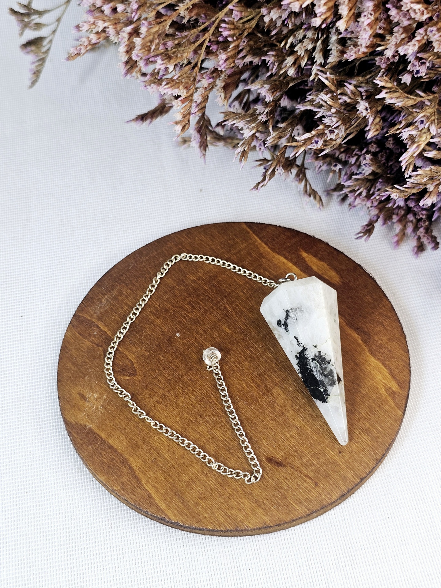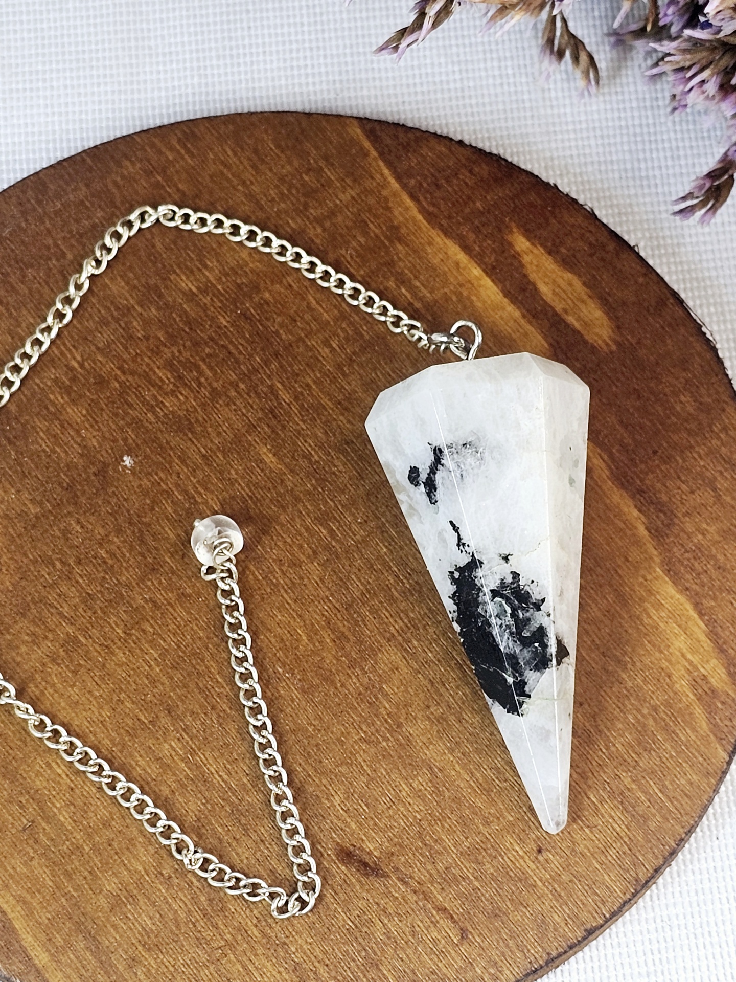 O Pêndulo de Pedra da Lua (Moonstone) é uma ferramenta espiritual elegante e carregada de simbolismo, ideal para práticas de meditação, cura energética e radiestesia. Feito com a delicada e mística Pedra da Lua, conhecida pelas suas propriedades de equilíbrio emocional e conexão com a intuição, este pêndulo é perfeito para quem busca uma conexão mais profunda com suas emoções e ciclos naturais.