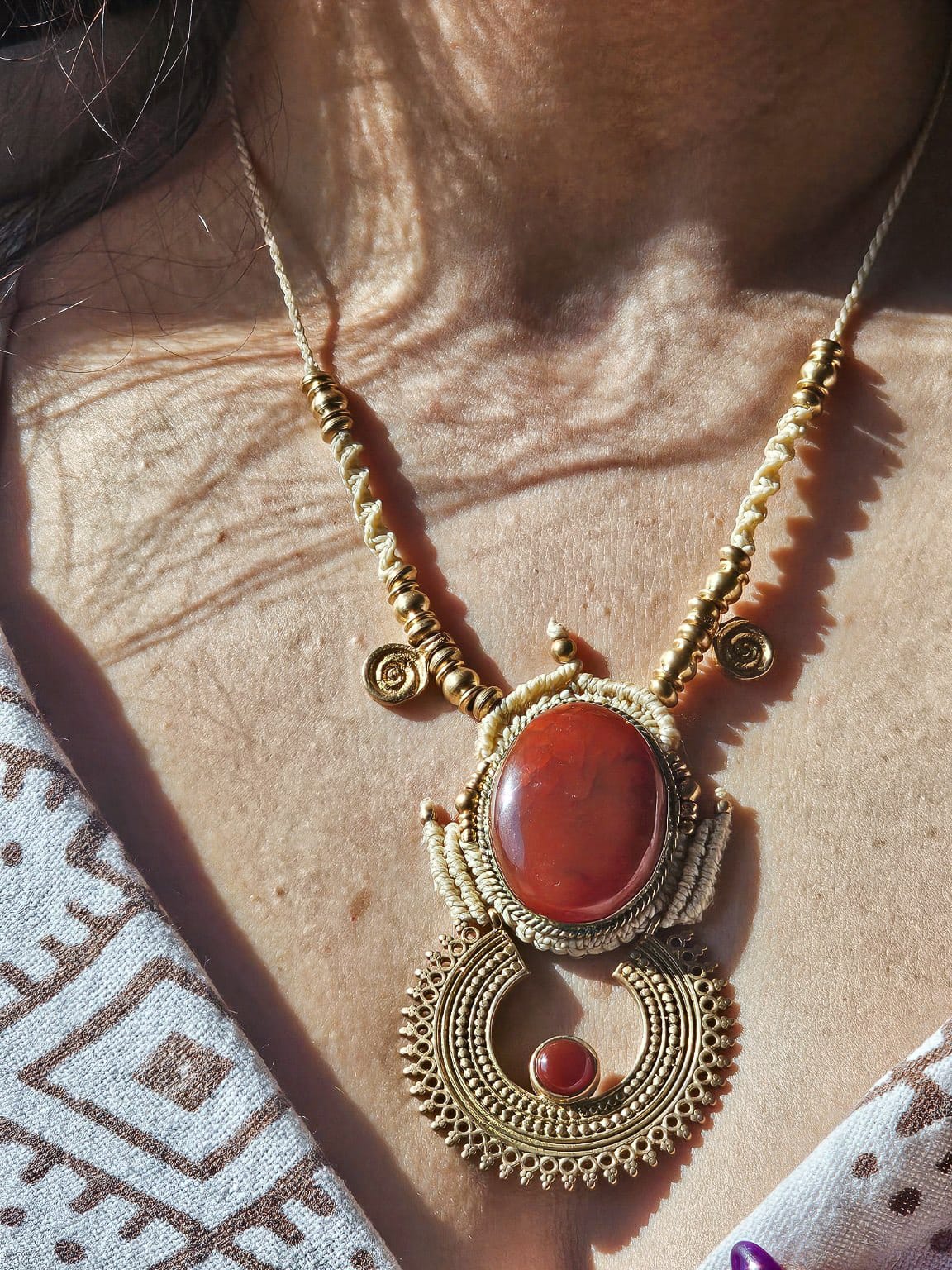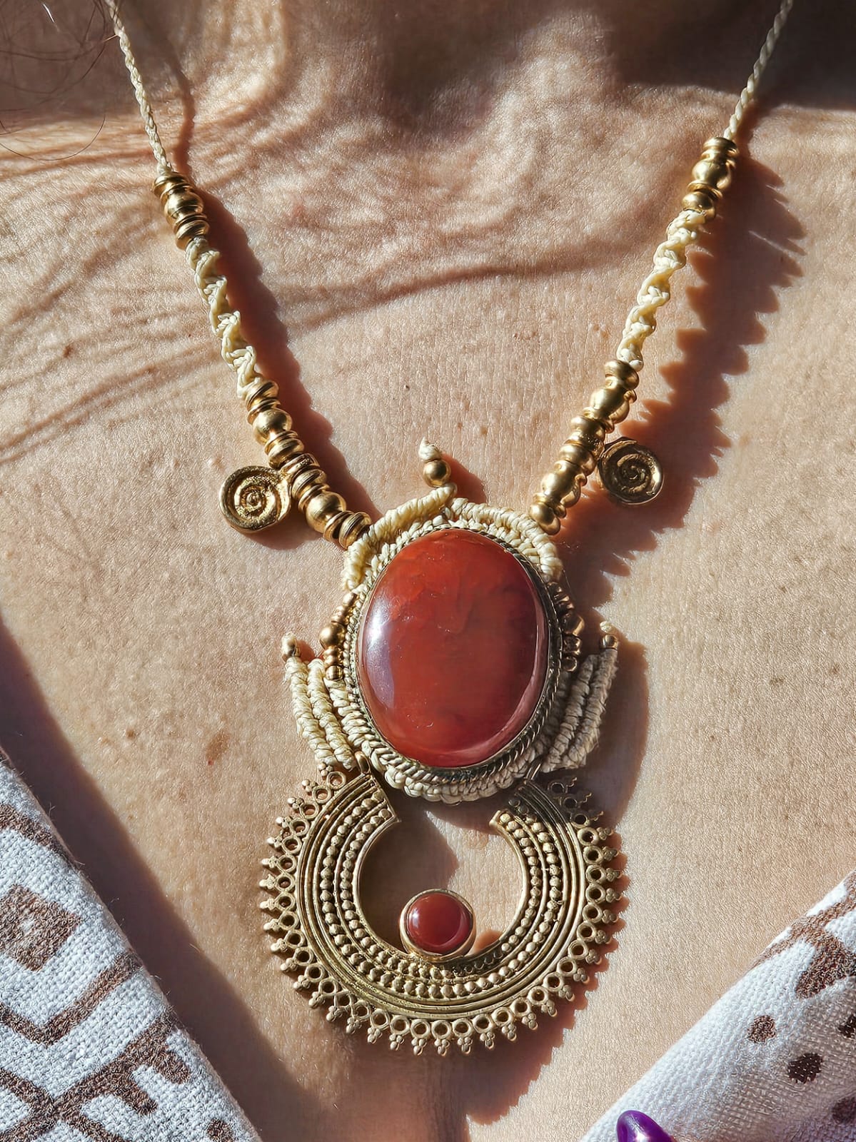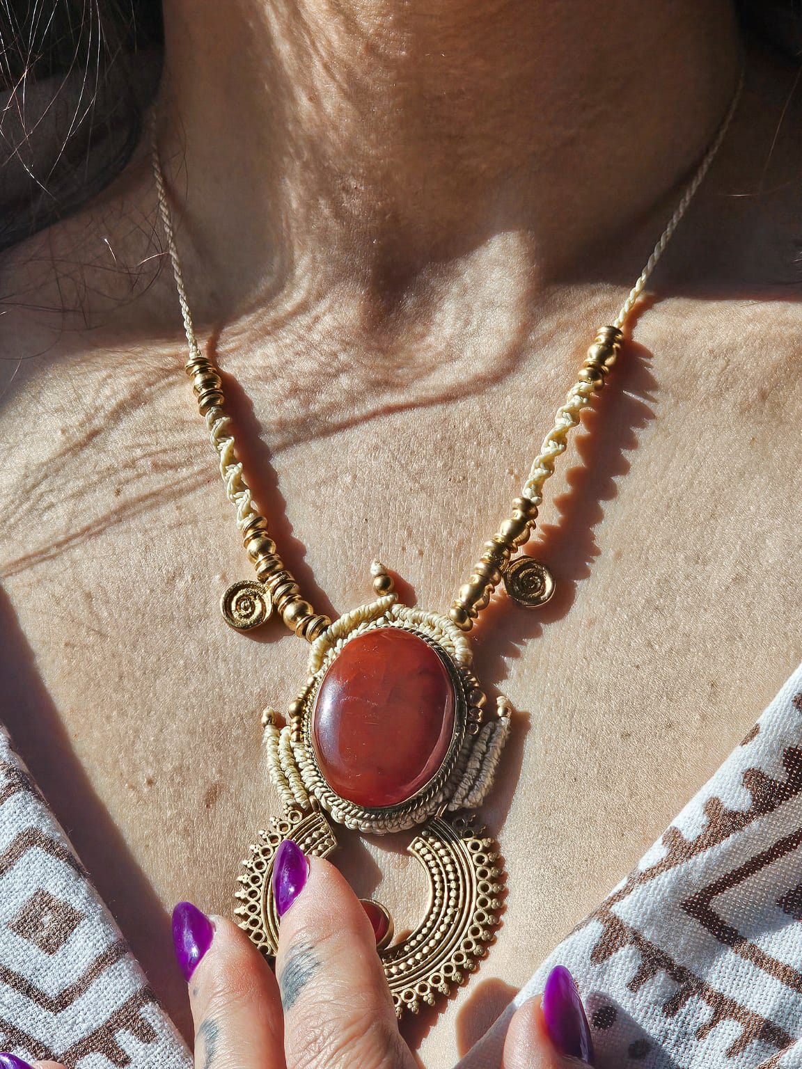 Tecida à mão em macramé, com detalhes em latão, esta criação une força e fluidez num design marcante e profundamente simbólico. No centro, a cornalina revela a sua energia vibrante — uma pedra associada à vitalidade, à coragem e à expressão.